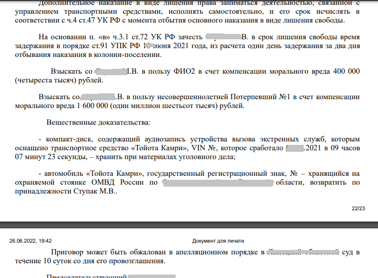 | Апелляция по статье 264 УК.Анализ уголовного дела, допросов, разночтений, решения суда первой инстанции. Подготовка апелляционной жалобы, участие в суде. | 20.000 тыс. |